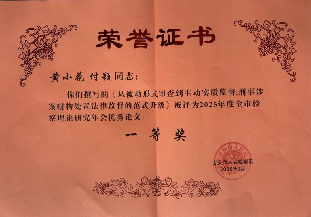 2月3日,吉安市人民检察院召开全市检察理论研究年会,会上通报了优秀理论研究成果和单位。峡江县人民检察院在全市检察理论研究年会上斩获佳绩!